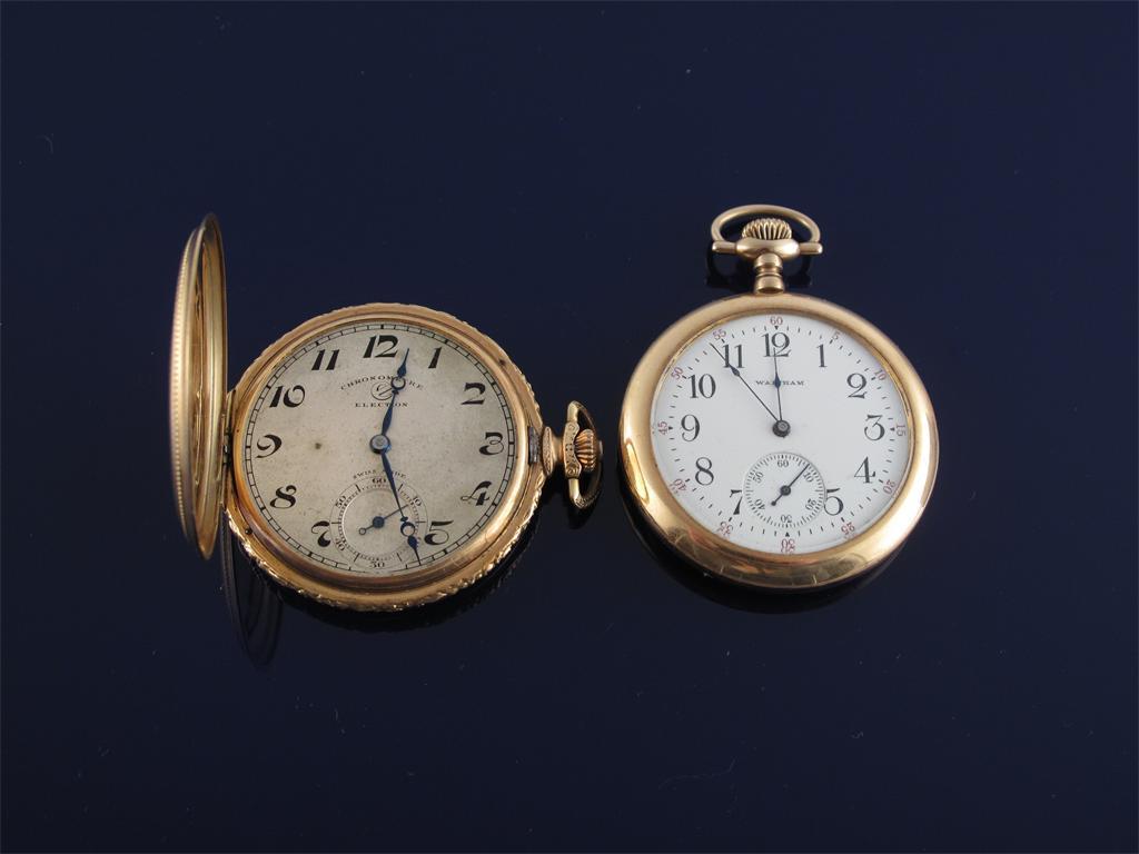 A gold dress watch. And a gold cased open faced pocket watch by Waltham with leather travel case.