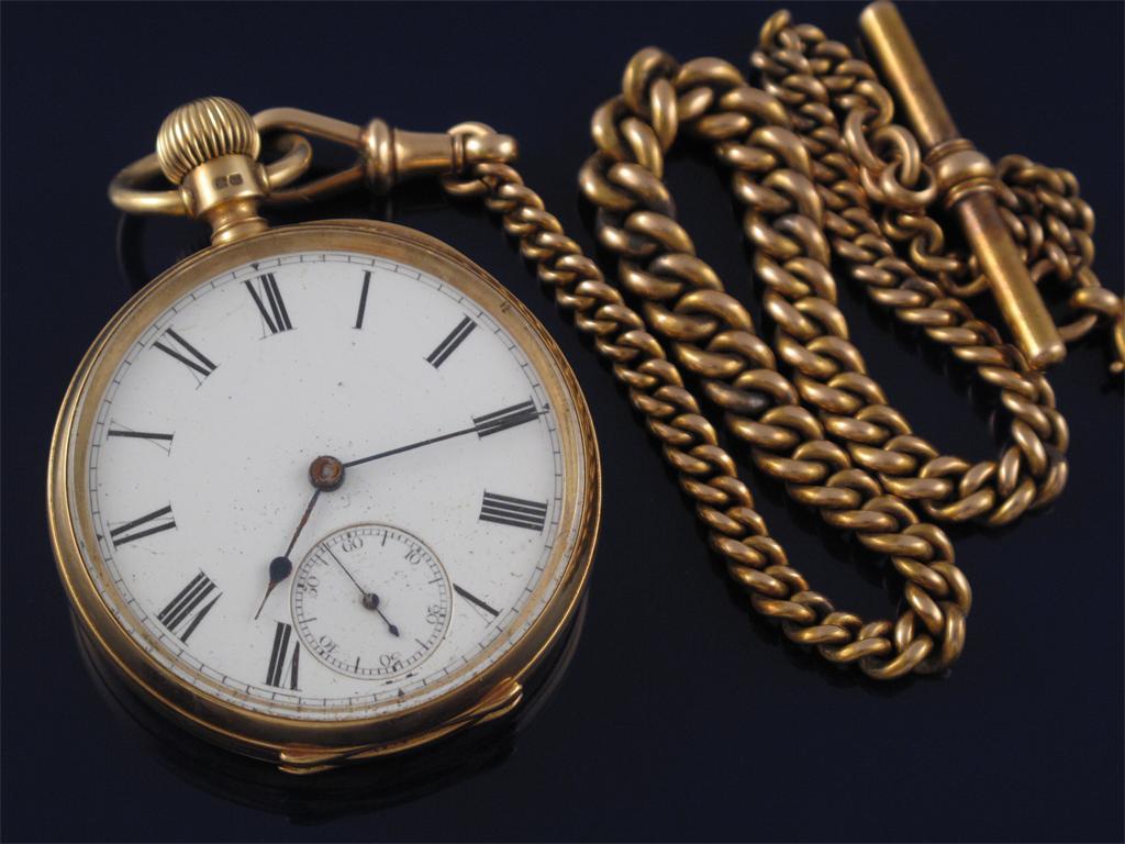 An 18ct gold open faced pocket watch. Subsidiary seconds dial. Birmingham marks. Three quarter plate movement. Signed Whitehead Market Harbre for the AM watch co, Waltham. With a gold graduated curb link watch chain. 51g.