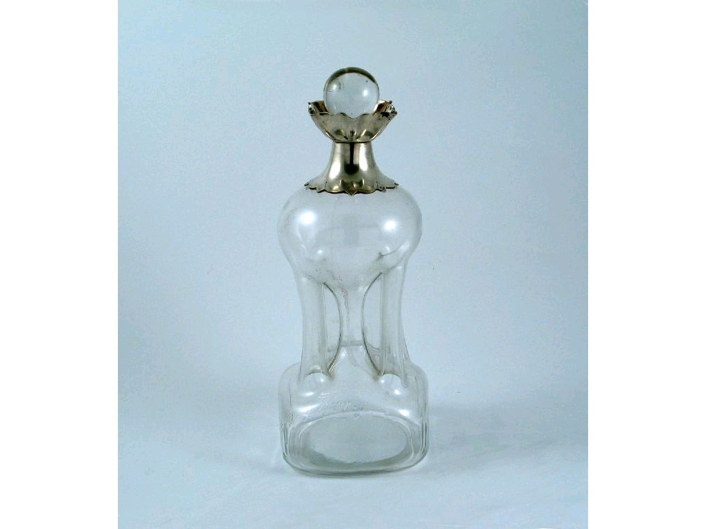 A late Victorian mounted clear glass decanter and stopper, with a waisted square body and four pouring spouts, by Thomas Simmons, London 1896, 11.4in (29cm) high.