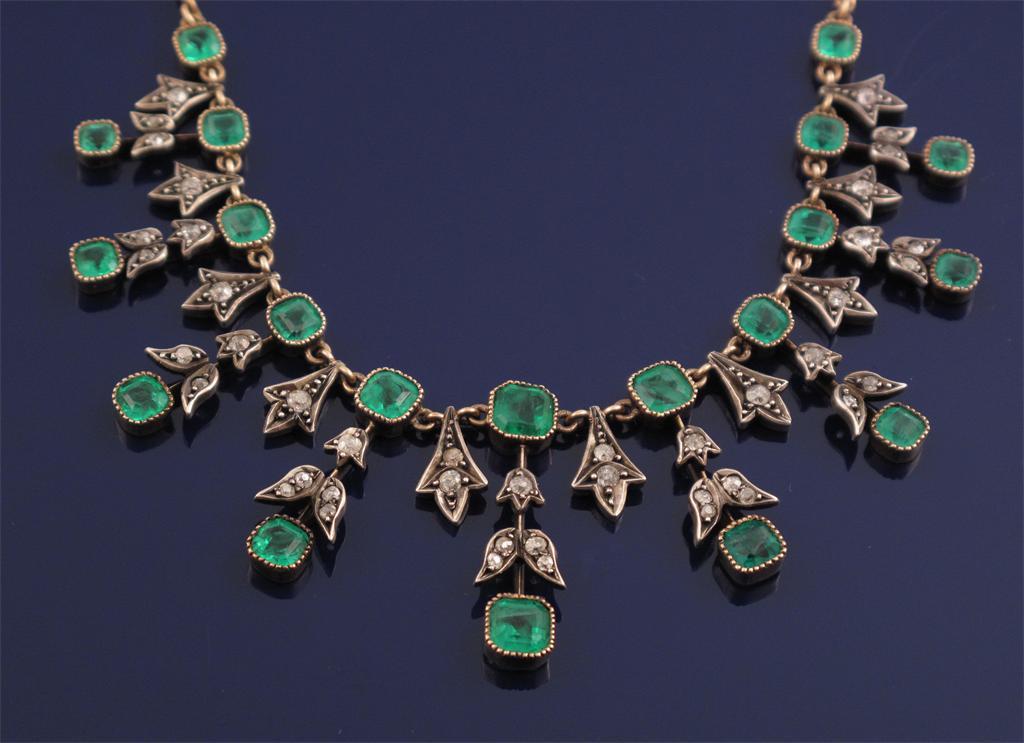 An emerald and diamond fringed necklace. Set with square shaped emeralds and small cushion shaped diamonds in silver and gold. Plain curb link gold necklace.