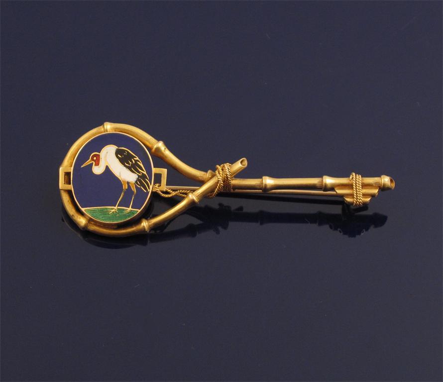 A gold bamboo brooch with enamel plaque depicting a crane. 6.5cm wide.
