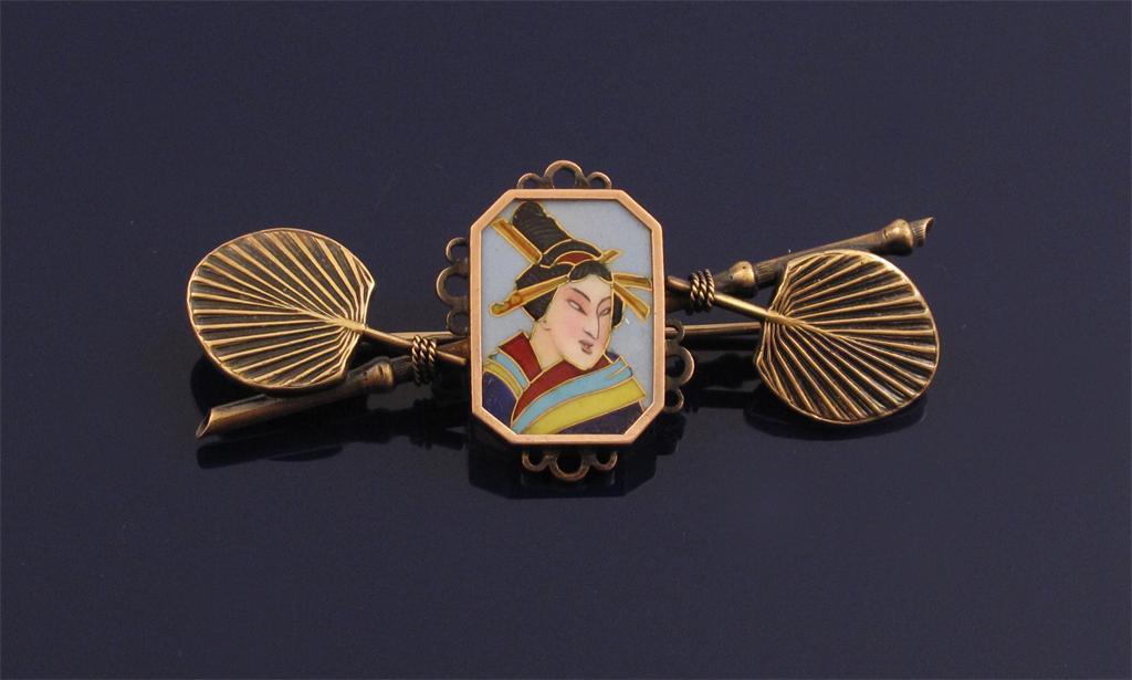 A 19th Century Aesthetic movement silver and gold brooch. Centered with an enamel plaque depicting a Japanese lady in formal dress with fan terminals. 6cm wide.