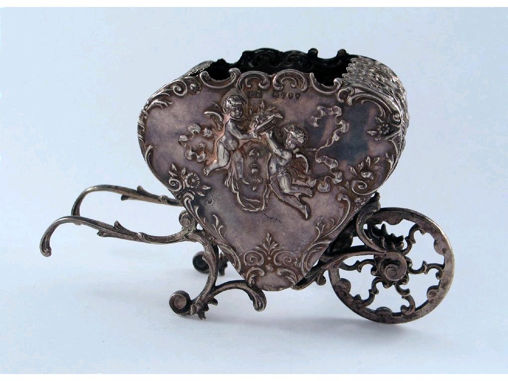 A late 19th century continental novelty box, in the form of a stylised wheelbarrow with a heart shaped hopper, by B. Muller, with English import marks for London 1895, 5in (12.5cm) long, 3.5oz.