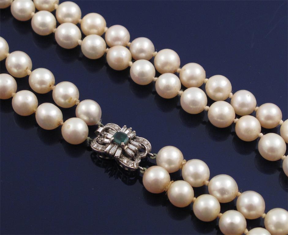 A two row cultured pearl necklace. The pearls graduate from 8.0 to 8.5mm. The white gold clasp set with an emerald and diamonds.