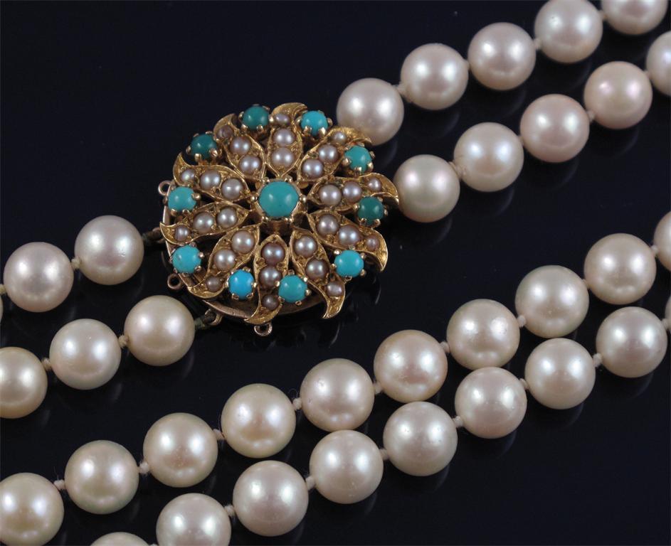 A two row cultured pearl necklace. The pearl graduate from 8.4 to 8.9mm with a turquoise and seed pearl set 9ct gold clasp.