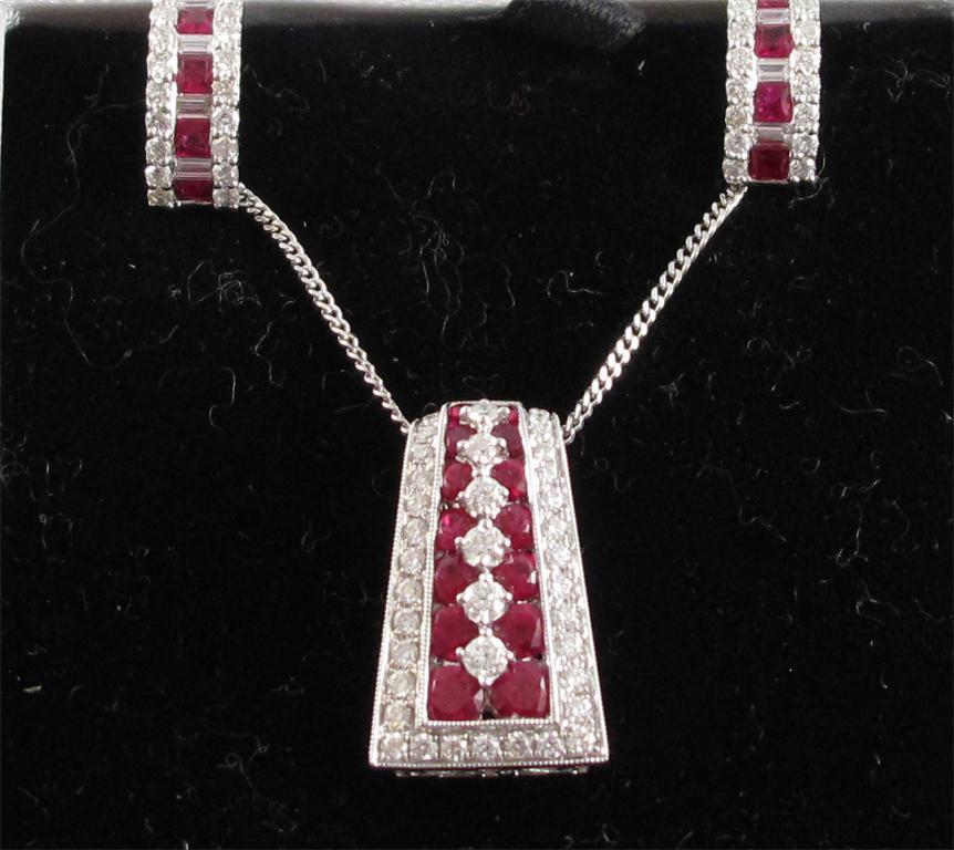 A ruby and diamond pendant set in white gold on a fine link white gold neck chain, with matching earrings. Cased.