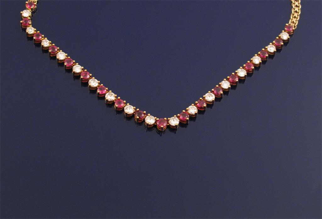 A ruby and diamond necklace alternately set with graduated circular cut rubies and diamonds in yellow gold. The diamonds weigh approximately 4.85 carats and the rubies 5.50 carats in total.