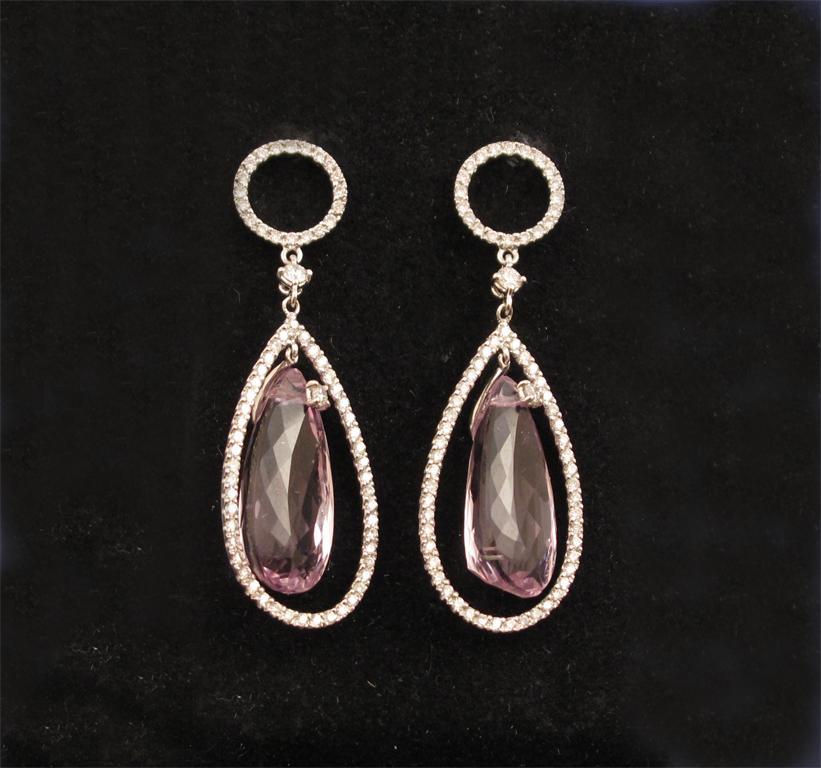 A pair of diamond and kunzite drop earrings. The pear shaped kunzites are set within a surround of circular cut diamonds in white gold.