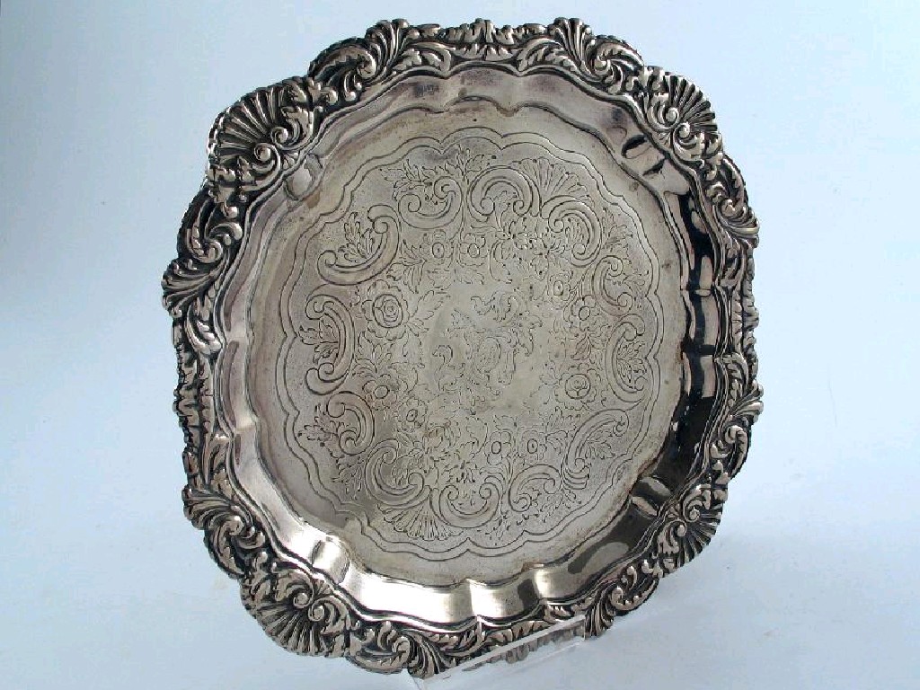 A George IV salver, with a flat chased centre and a wide border of foliate shells and scrolls, crested by Messrs Lias, London 1829, 10in (26cm) diameter, 20oz.
