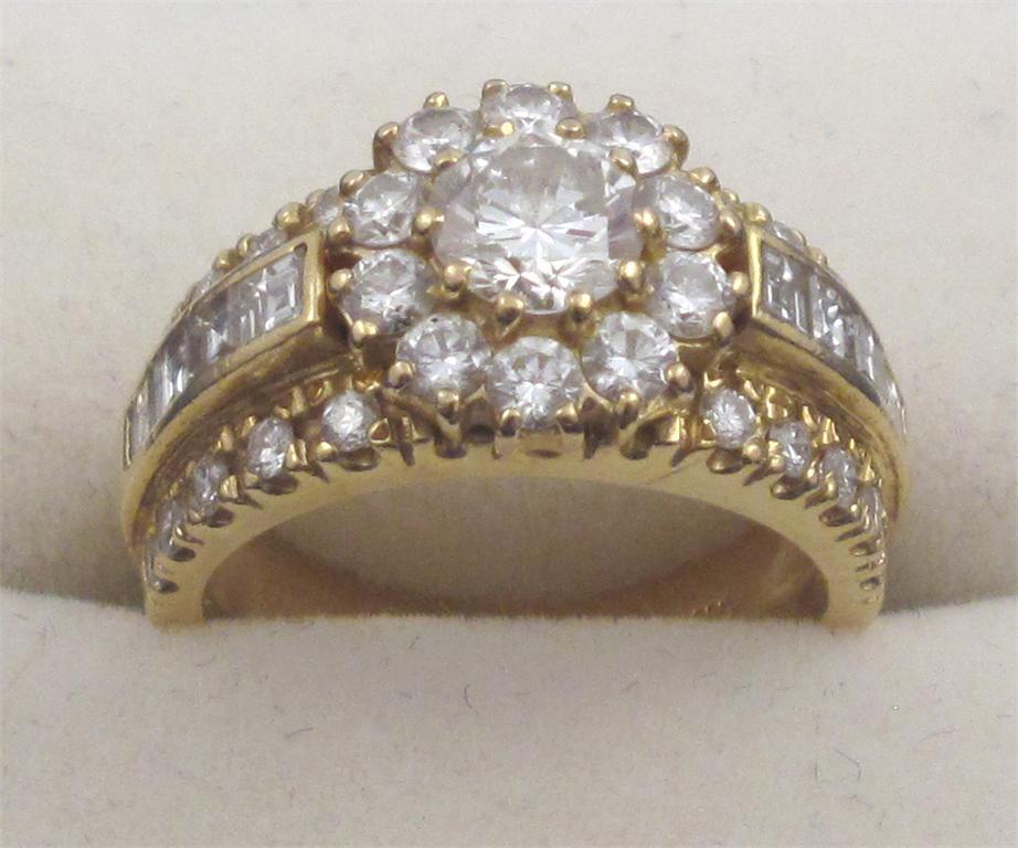 A diamond cluster ring centered with a cluster of circular cut diamonds and with square shape and circular cut diamonds to the shoulders. Size J 1/2. Similar to lot 1162.
