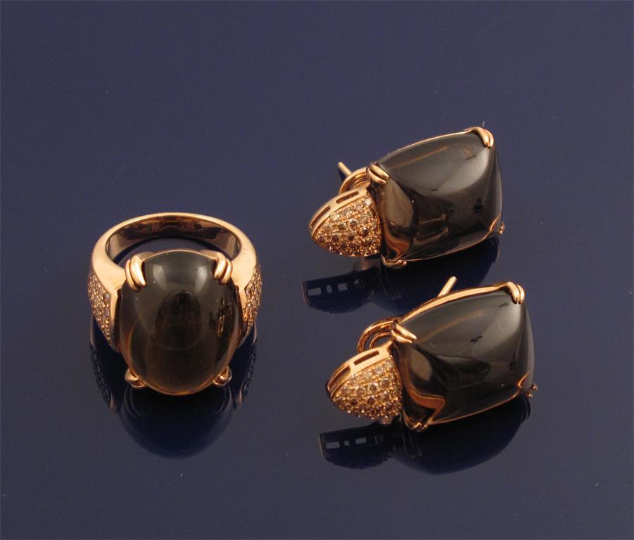 An oval cabochon smokey quartz set pink gold ring. Set with small fancy coloured circular diamonds to the shoulders size L 1/2. With matching earrings.