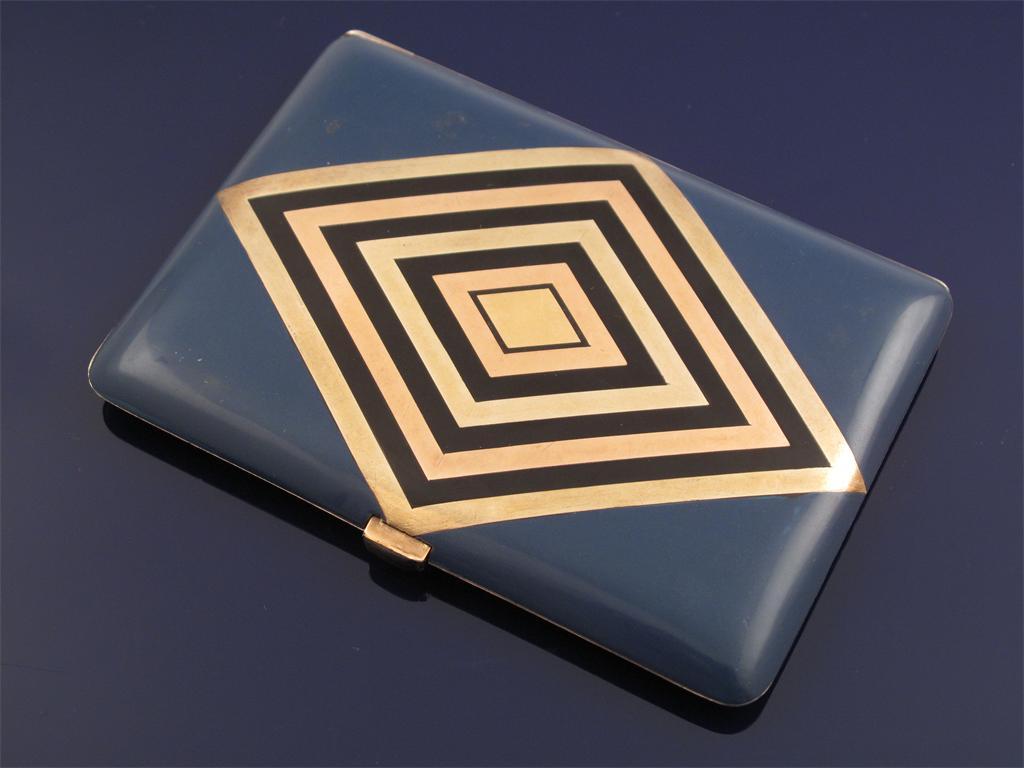 An Art Deco silver gilt cigarette case. Each side mounted with a lozenge of yellow and pink gold stripes alternately set with black enamel. Makers mark JNB and import marks for 1939. 12cm long.