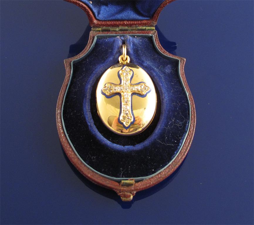 A gold oval locket pendant with diamond set cross in blue enamel surround. Associated box.