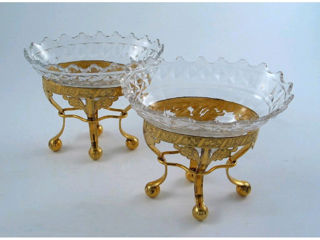 A pair of George III copper gilt sweetmeat dishes, with engraved decoration, ball feet and cut glass liners with shaped rims, c.1805, 6.2in (16cm) wide. (2)