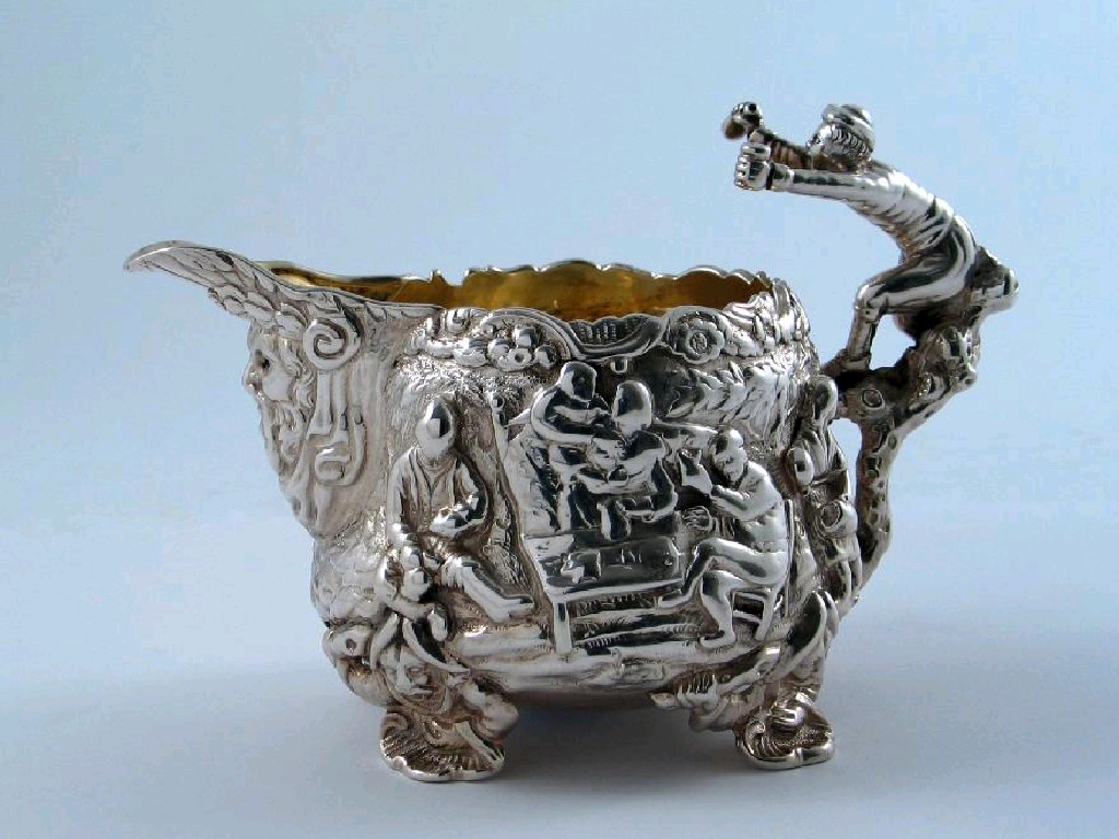 A George IV cast cream jug, on four charicture mask feet profusely decorated around the sides with scenes in relief from 17th century peasant life, mask spout, handle cast of a boy pouring condiments over the rim, by Edward Farrell, London 1829 (gilt interior), 4.25in (10.8cm) high, 14oz.