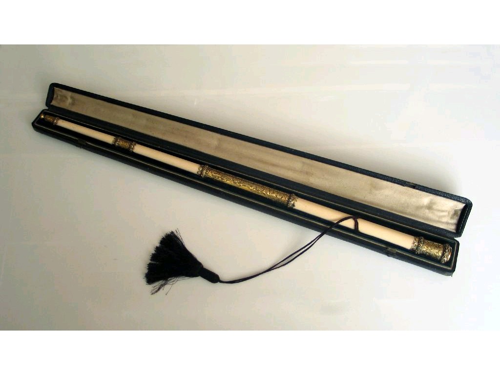 A Victorian silver gilt mounted ivory baton with engraved and chased decoration and a cord tassle, by William Neale, London 1869 (in a fitted case), 21.9in (55.5cm) long.