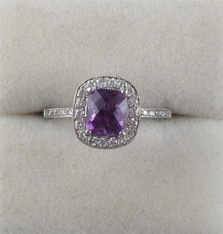An amethyst and diamond cluster ring. The cushion shaped amethyst is set within a surround of diamonds and further smaller diamonds to the shoulders in white gold. Size N 1/2.
