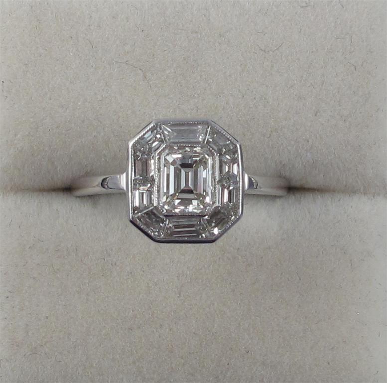 A diamond cluster ring. Centered with an emerald cut diamond which weighs 1.01 carats. Within a surround of baguette shaped diamonds which weigh a further 0.70 carats in white gold. Size O 1/2.