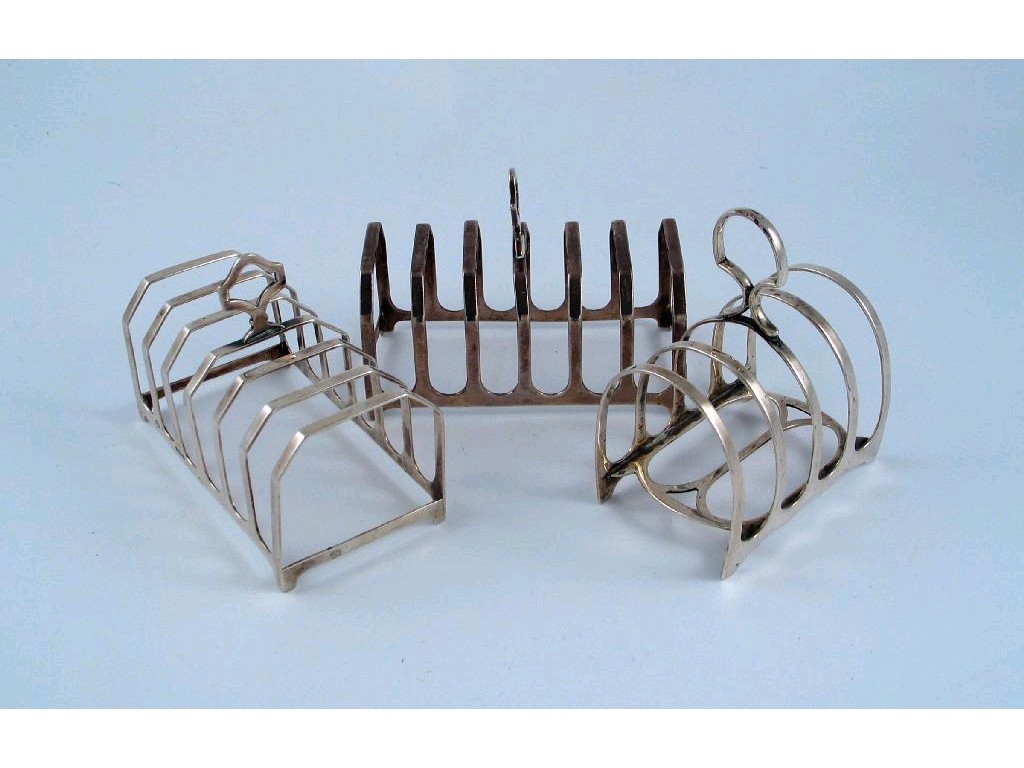 Three small modern toast racks, mixed makers and dates (one by Messrs Hutton, two by Adie Bros), 7oz. (3)