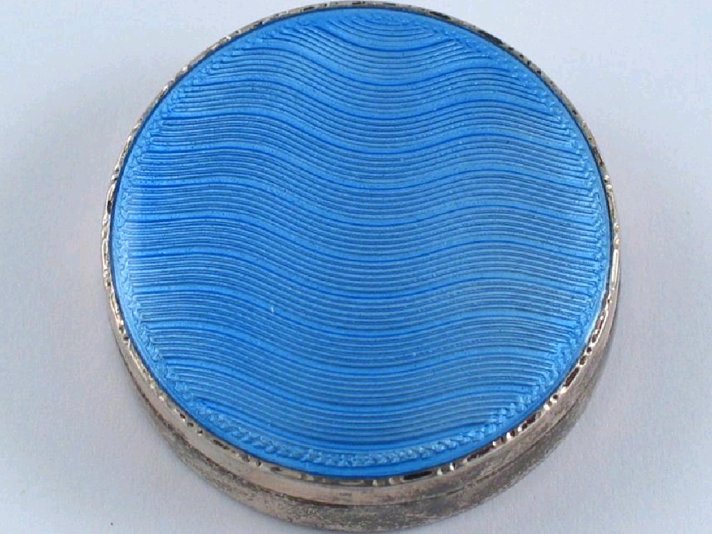 A modern circular pill box, with a pull-off, blue enamelled cover, by W. Neale Ltd, Birmingham 1936, 1.5in (3.8cm) diameter.