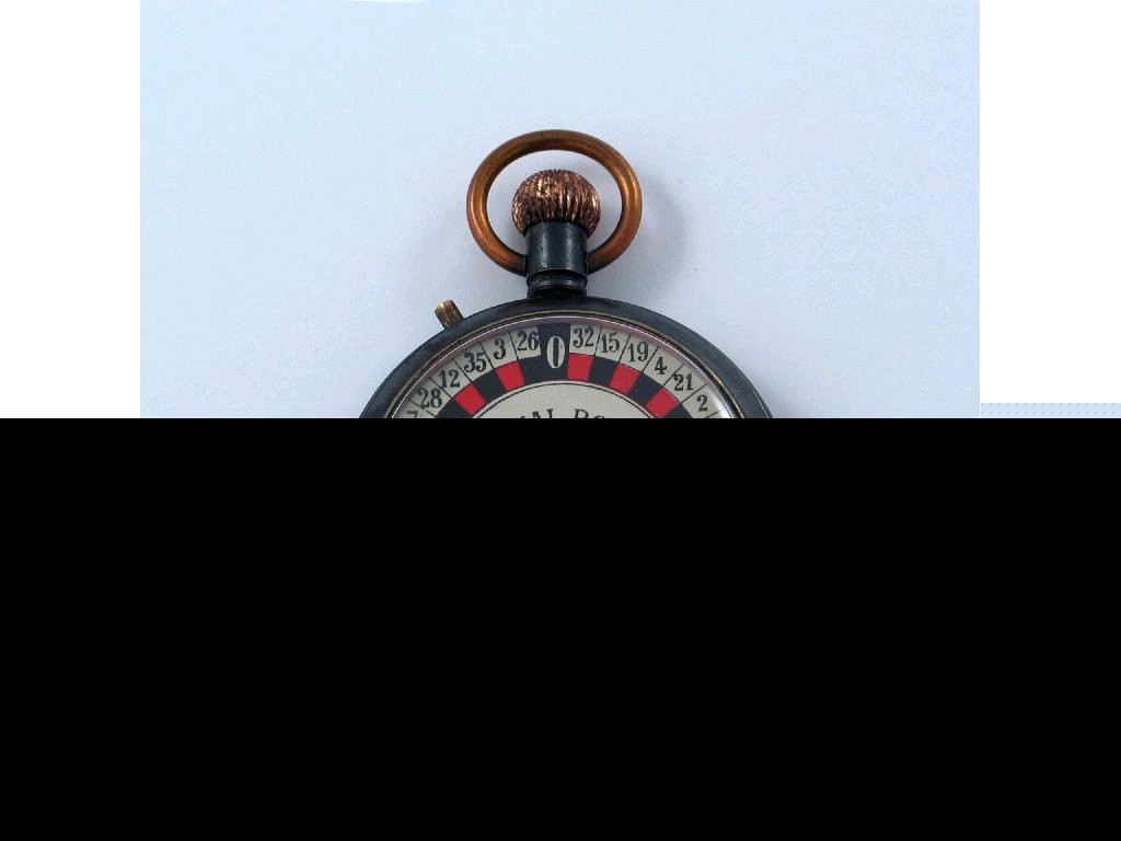 A Victorian gun-metal "perpetual roulette" game, in the form of a pocket watch with a painted dial, 2in (5cm) diameter.