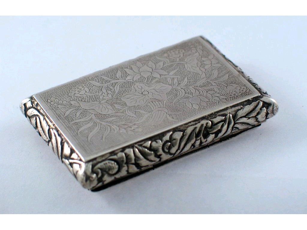 A mid 19th century Chinese Export snuff box, with florally engraved cover and base and chased convex sides. Maker's mark of Knee CHong (with Chinese character mark) 1850-60, 24' (6cm) 1.5oz.