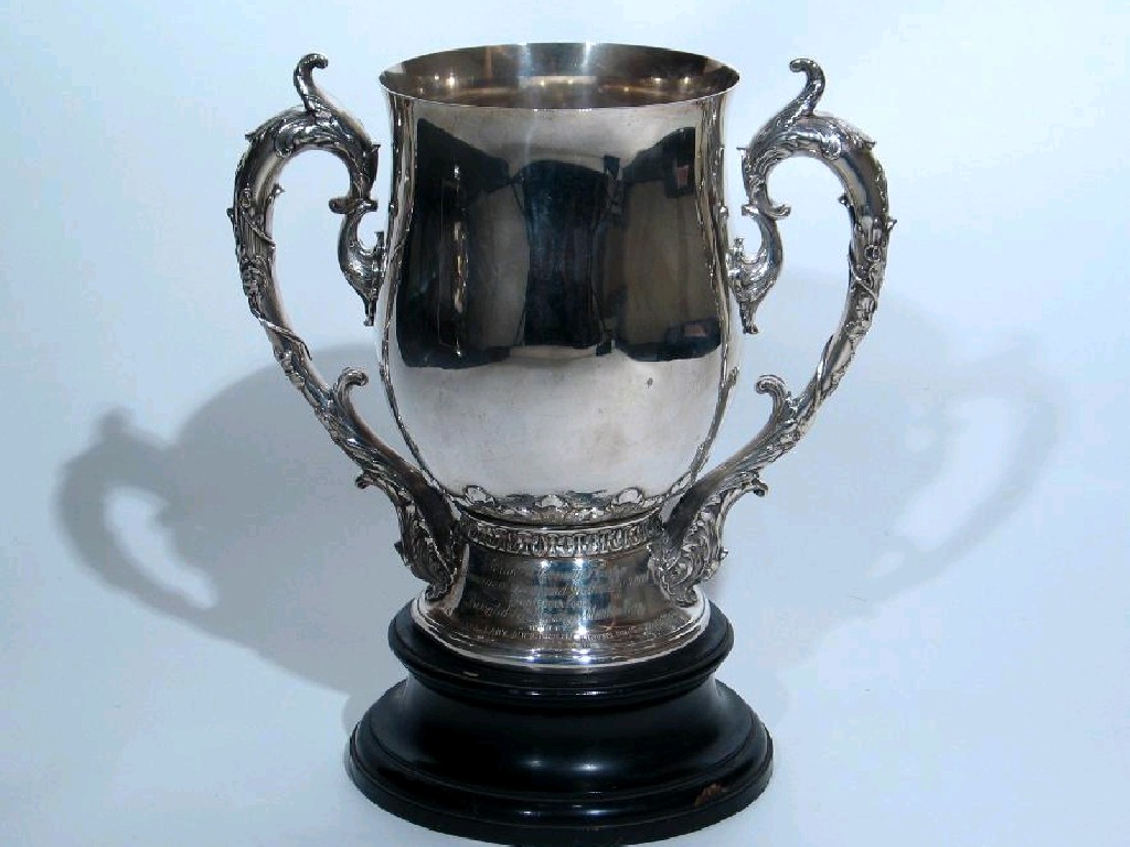 A late 19th/early 20th century American two-handled trophy cup, of baluster form with foliate scroll handles and a flared foot, with a small presentation inscription, maker's mark a griffin with a "w", possibly by the whiting manufacturing Co, c.1900 (on a wooden plinth), 11.75in (30cm) high, 74oz.