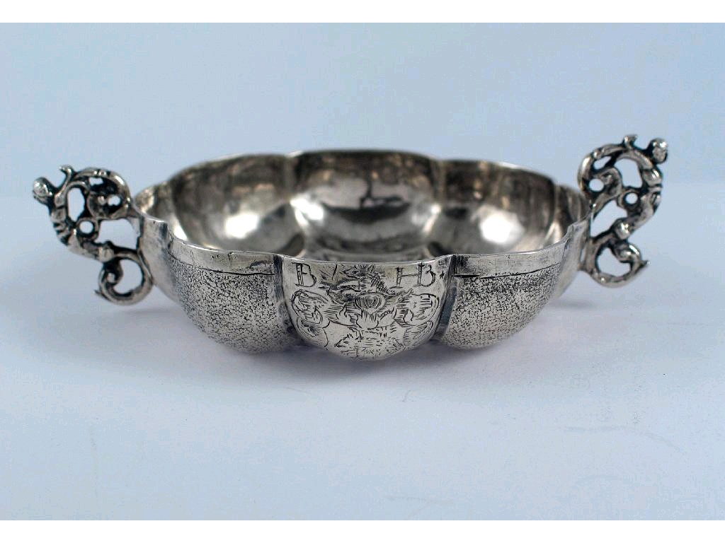 A 17th century lobed circular wine taster or sweetmeat dish, with two scroll handles, part polished and part matt decoration, engraved on one side with a coat of arms and dated "1658" on the other, unmarked, probably Dutch mid 17th century, 4.25in (10.6cm) wide overall, 1.25oz.
