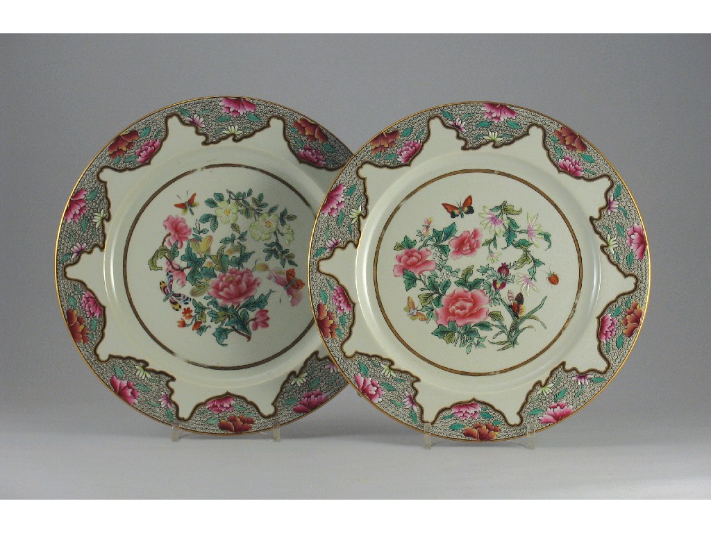 A pair of Royal Worcester plates, retailed by Daniell and Son, decorated in the famille rose style, c.1887, 25.5cm. (2)
