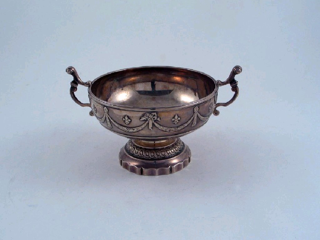 A 19th century French marriage bowl, with a shaped pedestal foot, two harp-shaped handles, a central inset medallion and a frieze of festoons around the bowl, inscribed "de MAGNY", with pseudo marks, second half of the 19th century, 5" (13cm) diameter, 10oz.