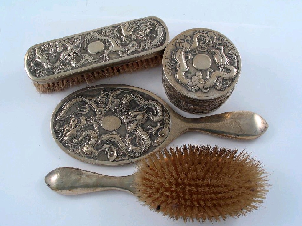 An Early 20th Century Chinese dressing table box and cover, a hand mirror and two brushes, each embossed with dragons, (four in the lot) 4.5oz wieghable silver.