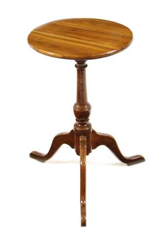 A late 18th century fruitwood tripod table, the circular top (fixed) on a turned stem and cabriole legs, 24.75in (62.7cm) h, 19.25in (48.7cm) w.