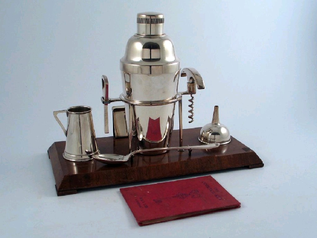 A modern plated cocktail set, on a walnut veneered base comprising a shaker, a funnel, a measure, a corkscrew, a bottle opener, a sterling spoon and "The Cocktail Key", a recipe guide, 12in (32.5cm), wide overall.