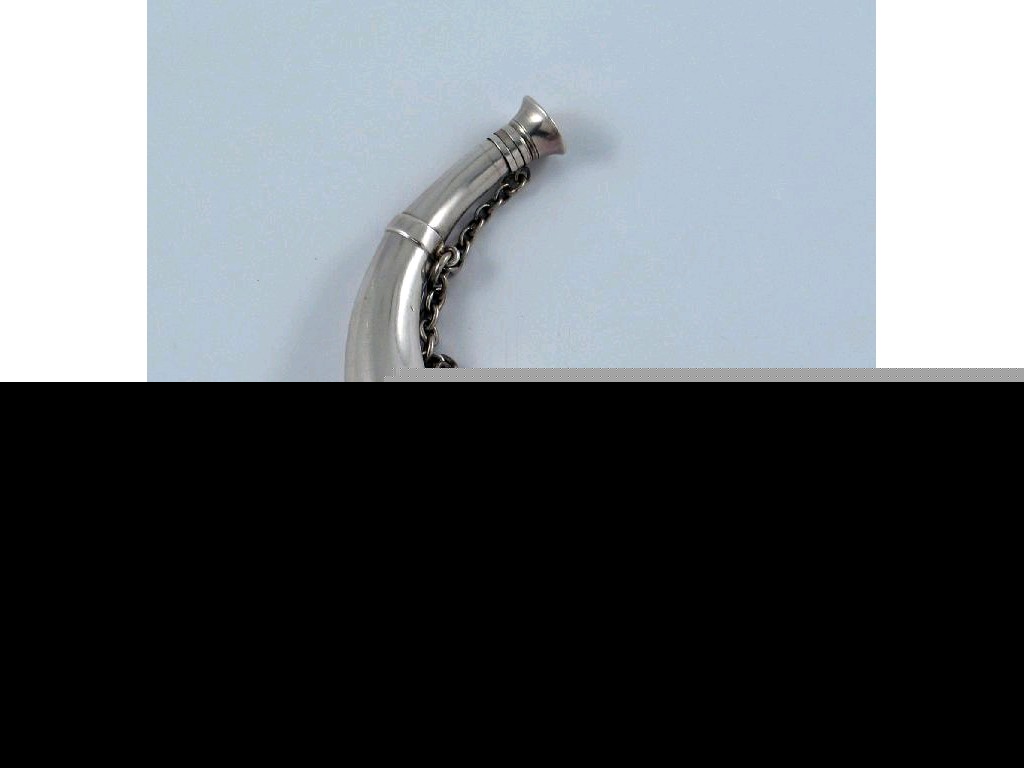 A Victorian horn shaped vinaigrette and scent bottle, combined with suspensory chain, initialled and dated '1875' by Samspon Moredon, London 1874, 4.25in (11cm), 2oz.