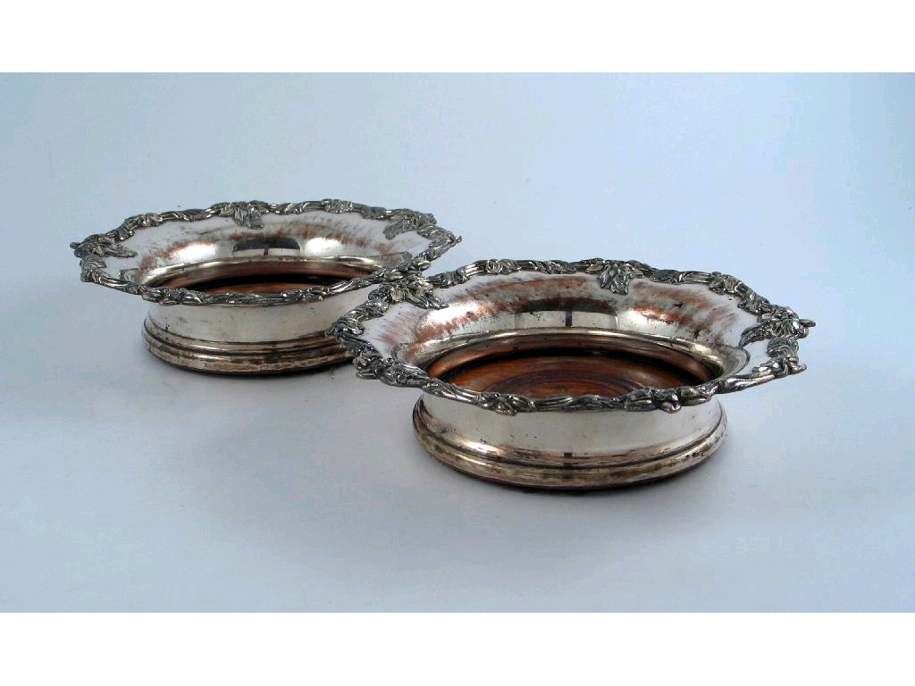 A pair of late period Old Sheffied Plated wine coasters, with turned wooden bases and everting floral rims, c.1840, 7 3/4in (19.7cm). (2)