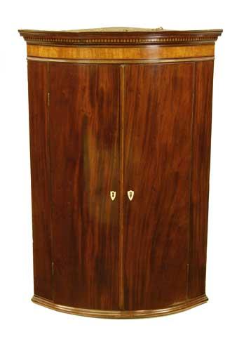 A George III mahogany bowfront hanging corner cupboard, with a satinwood dentil cornice and frieze above four shelves and two spice drawers, 42.5in (108.2cm) h, 29.5in (75cm) w, 20.5in (52cm) d. Lock and escutcheons replaced, restoration.