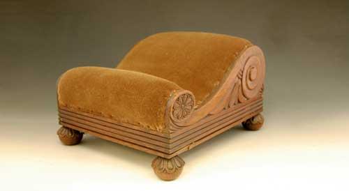 A Regency mahogany foot stool, carved with a leaf scroll and paterae above a reeded edge and on lobed bun feet, 9in (22.7cm) h, 15in (38cm) w, 12.5in (31.6cm) d.