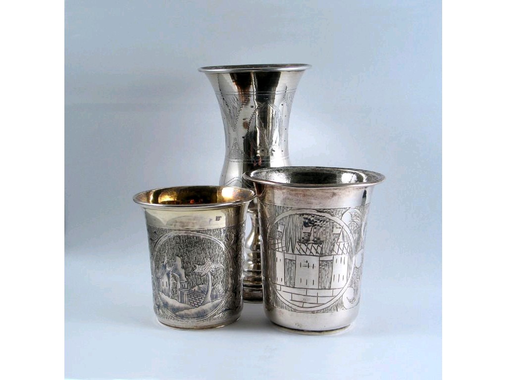 An engraved Kiddish cup London 1903 and two late 19th century Russian beakers: one engraved with architectural scenes, the other with niellwork, mixed makers and dates, 8oz. (3)