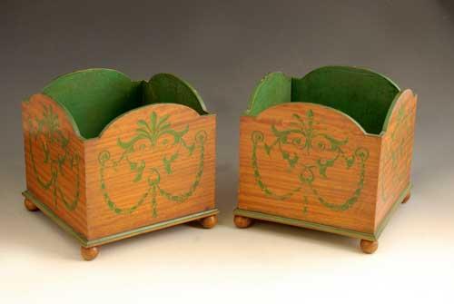 A pair of satinwood jardinieres, each painted with scrolls of bell flowers and foliage, early 20th century, 7in (17.5cm) h, 7.25in (18.7cm) w. (2)