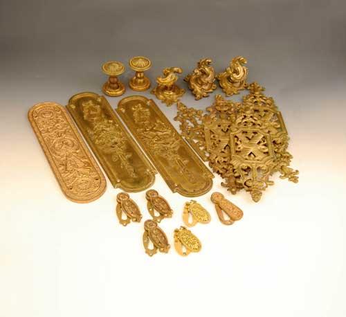 A collection of ormolu and gilt brass door furniture, to include: a pair of hand plates in late 18th century style decorated with cherubs, musical instruments and ribbon tied drapes, a set of five pierced Louis XVI style hand plates, a Victorian hand plate with matching escutcheon, three Rococo door knobs etc, 11.25in (28.4cm) max. (19)