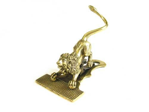 A Victorian brass paper clip, cast as a crouching lion, 4.5in (11.5cm) l.