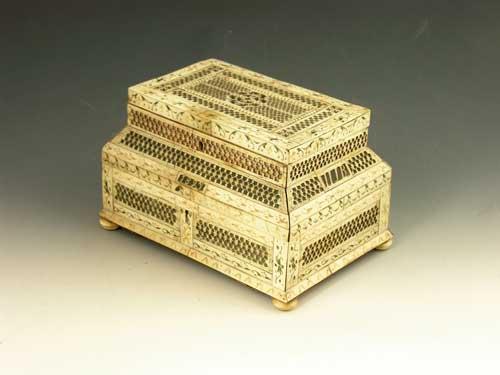 An early 19th century Russian bone wedding casket, with pierced, engraved and lac decoration, the hinged top to a paper lined interior, above a panel with the date '1827', the sides with initials, the main body with a divided interior on disc feet, probably Archangel, 6.25in (15.6cm) h, 10.25in (26.2cm) w, 7.25in (18.2cm) d.