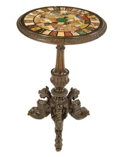 A 19th century Italian specimen marble tripod table, the circular inset top to a fluted stem and carved mythical beast monopodia supports, the underside of the table inscribed 'ROMA 1875' the base signed 'R. Buzon', 32.25in (82cm) h, 21in (53.4cm) dia. Chips and minor losses to edges.