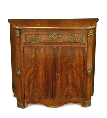 A Dutch mahogany and gilt metal mounted cabinet, with a frieze drawer above a pair of ribbed doors enclosing a shelf, 27.25in (68.7cm) h, 30.25in (76.8cm) w, 11.5in (29cm) d. Cracks, veneer loss and replacements.