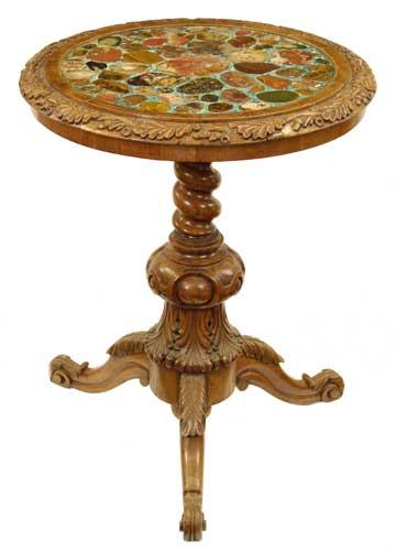 A Victorian carved walnut tripod table, the circular top inset various agates and hardstone specimens into a scagliola ground, to an acorn and oak leaf edge and on a spiral twist stem to acanthus carved cabriole legs and scroll feet, 29.25in (74cm) h, 23.5in (59.5cm) dia. Old damages and restorations.