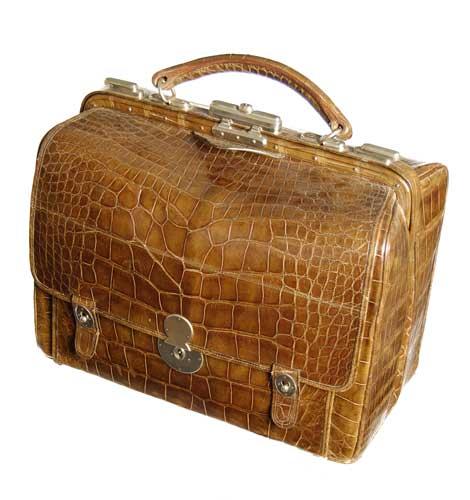 A crocodile Gladstone travelling bag, with chrome mounts and a leather lined interior with a pocket, the front with a fitted water silk lined pocket with an easel ivorene mirror, scissors, penknife, file, button hook, and tweezers, a lift out board with handle and mounted an alarm clock, hair brush, clothes brush, three glass bottles with covers, and a circular pot and cover, on five stud feet, 13.25in (33.5cm) w.
