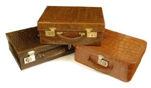 A crocodile small case, stamped 'BRUFORD & SON LTD EXETER & EASTBOURNE' with a suede lined interior 14in (35.5cm) w, a crocodile small case with stamped initials 'E.E.C.H.' with a suede lined interior, a crocodile small case having a leather interior with internal belt and easel mirror. (3)