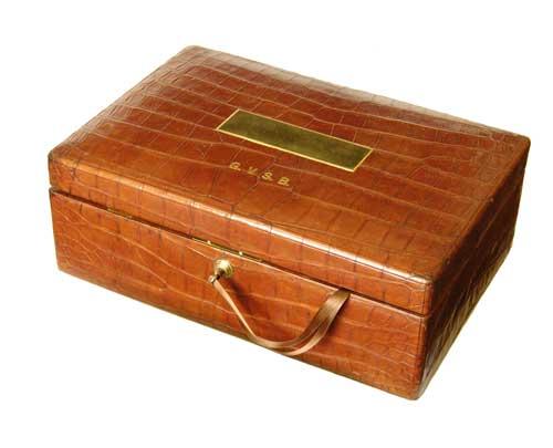A crocodile despatch box by J.C. Vickery, the cover with an inset vacant brass plaque and initialled below 'G.V.S.B.' with a green leather interior having a blotter pad in the cover and a lift out tray with inkwell, vesta box with strike and a further tray, brass mounts and Bramah style lock, the front edge stamped 'J.C.VICKERY, TO THEIR MAJESTIES THE KING & QUEEN. 179, 181,183 REGENT ST.W,' 16in (40.5cm) w.
