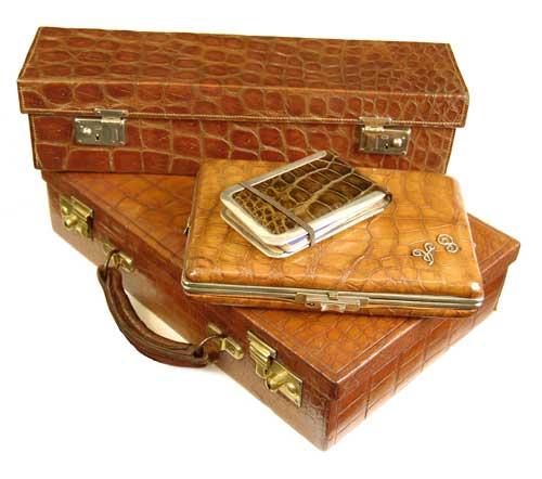 A crocodile writing case, the cover stamped 'H.E. JAN 1909,' with a green leather interior with pockets and a loose blotter pad, 14in (35.5cm) w, a rectangular box with trade label for 'CUTHBERTSON & HARPER, CALCUTTA,' a document case with applied initials 'E.A.' stamped 'FINNIGAN, MANCHESTER', and a silver mounted note pad wallet, London 1886. (4)