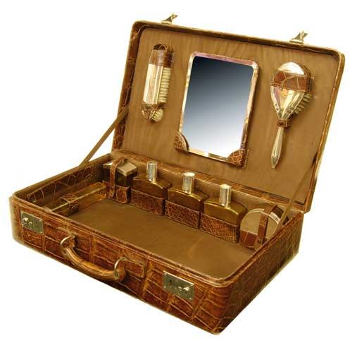 A crocodile travelling case, with a fitted interior having an easel back mirror, two brushes, six various amber glass bottles with silver coloured metal covers, engraved a date '28.10. 1946' and initialled 'H.J.', some stamped '835', on four stud feet, 19.75in (50cm) w.